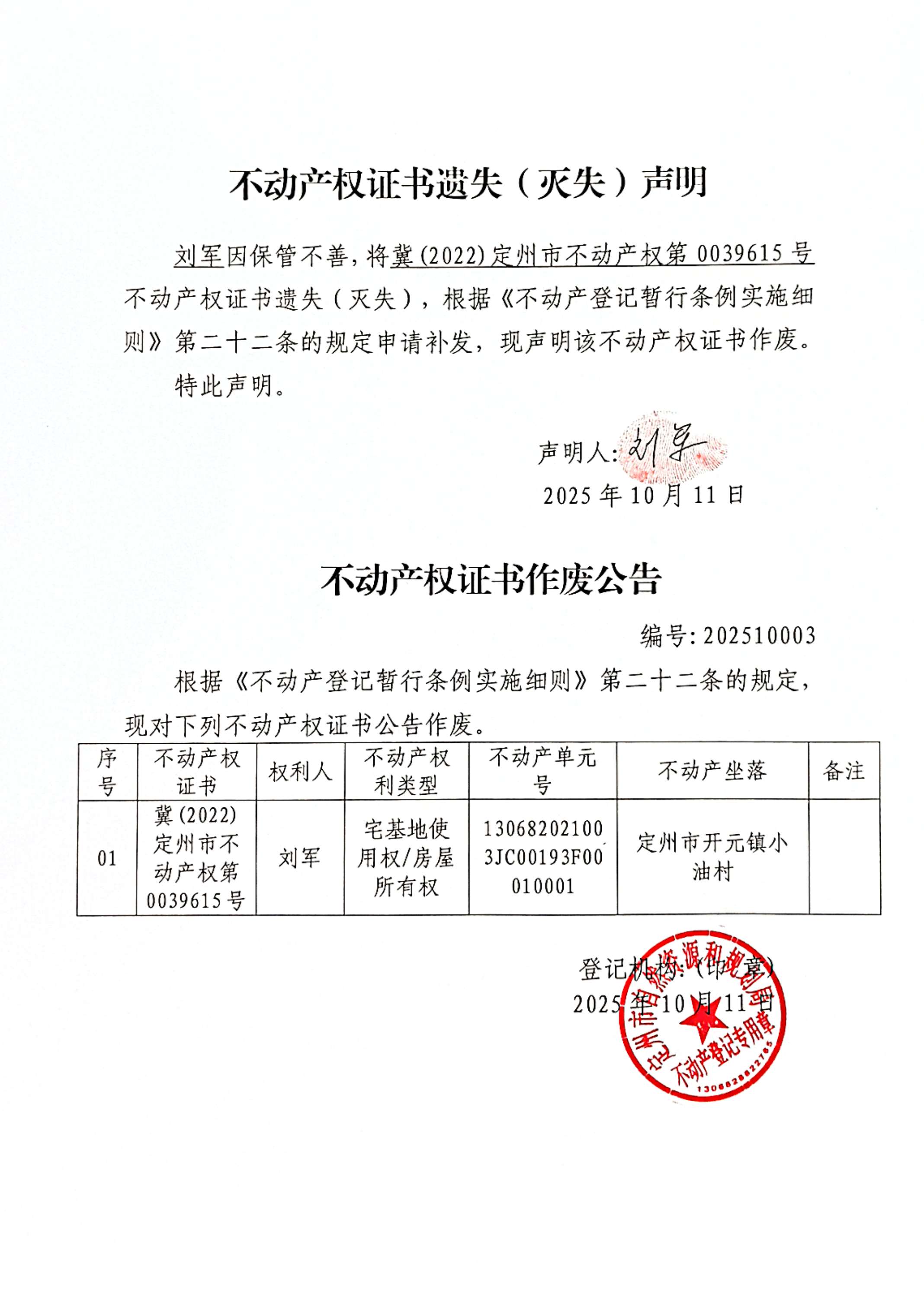 不動(dòng)產(chǎn)權(quán)證書遺失(滅失)聲明