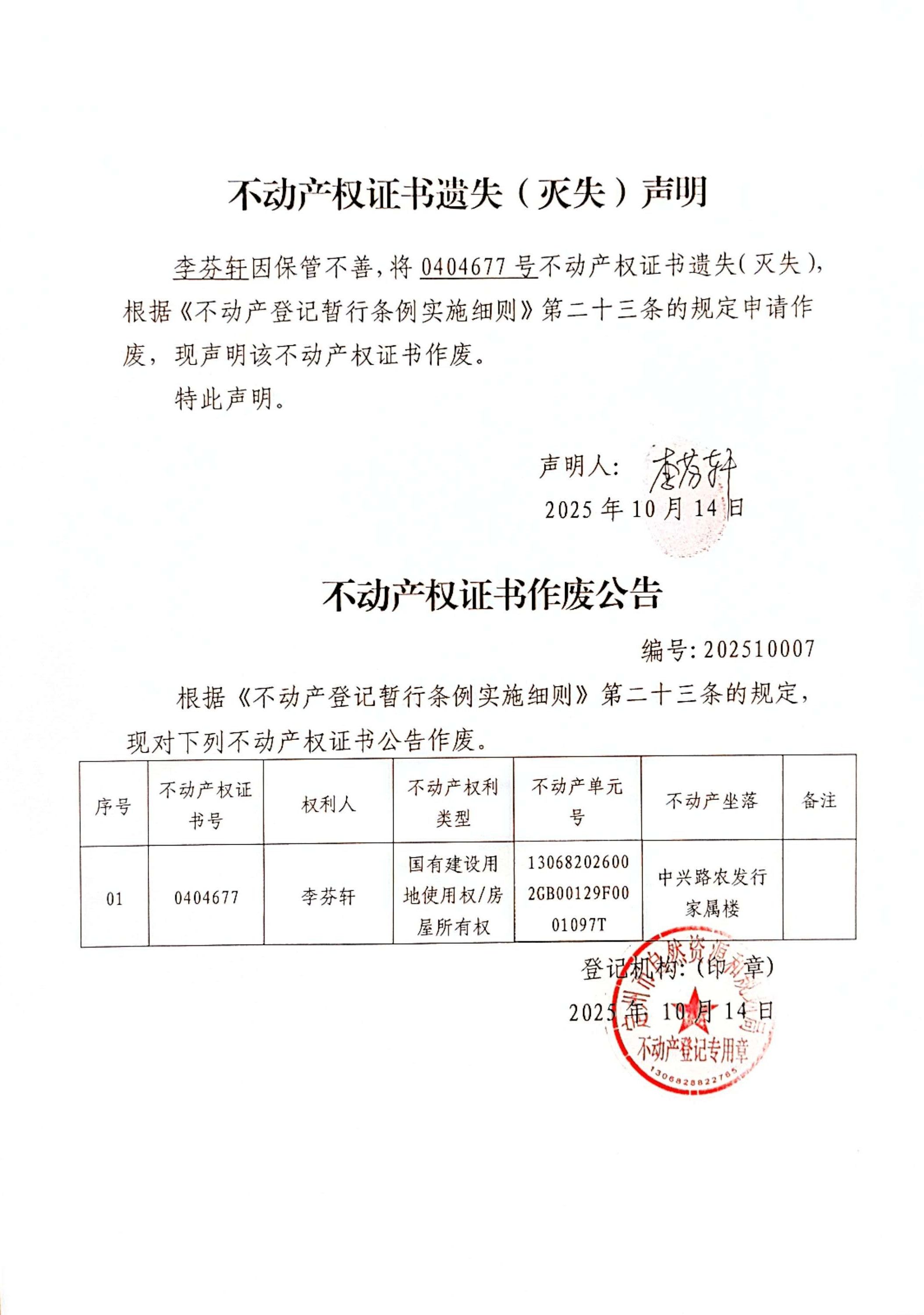 不動產(chǎn)權(quán)證書遺失(滅失)聲明